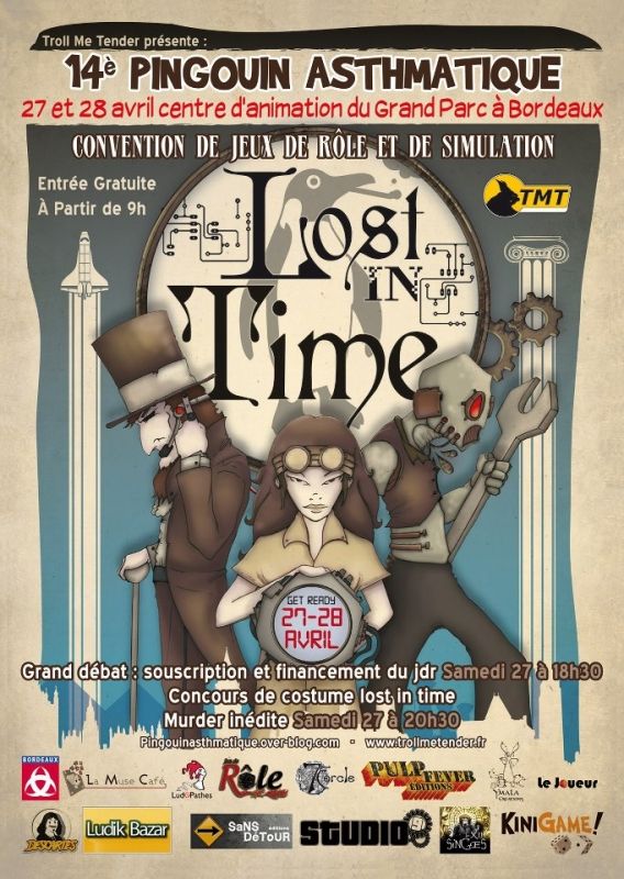 Au programme de cette convention: des tables de jeux de rôles, du jeu de plateau, un débat autour du thème "Souscription et financement d'un JDR" avec plusieurs intervenants, un concours de déguisement sur le thème lost in time et une Murder Party inédite le samedi soir...