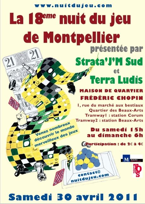 Strata'j'm Sud et Terra Ludis organisent la dix-huitième Nuit du Jeu, qui se déroulera le samedi 30 avril 2011 à la Maison de Quartier Frédéric Chopin, de 15 h à 6 h du matin.