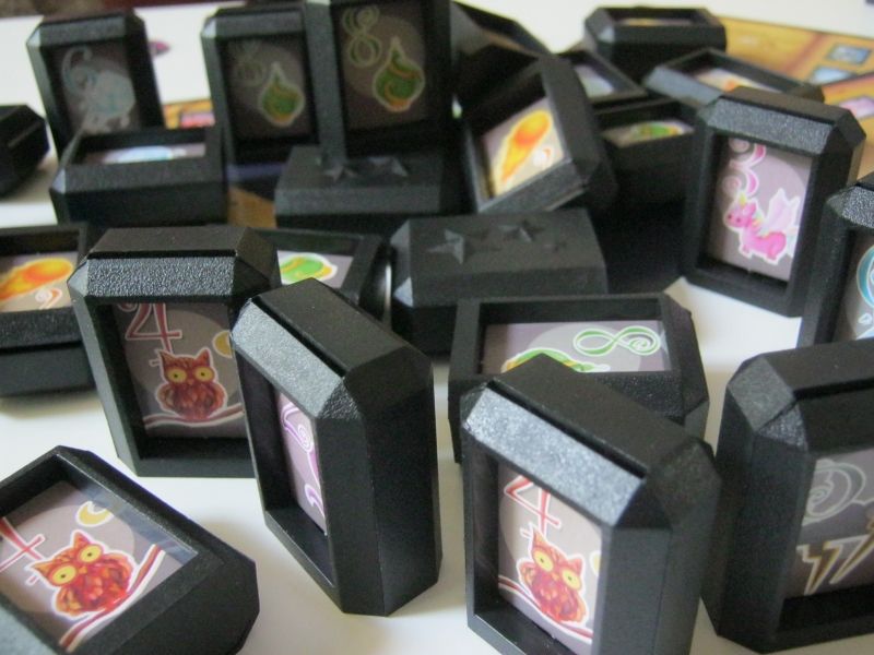 Ce ne sont pas moins de 36 pierres magiques que vous pourrez retrouver dans la boite. À l'intérieur de celles-ci vous allez encastrer des tuiles représentant les différents pouvoirs du jeu, tous représentés par un chiffre allant de 1 à 8, accompagnés d'un symbole. Ces pierres en plastique sont assez imposantes et permettent de tenir debout tout en vous cachant l'information qu'elles contiennent.