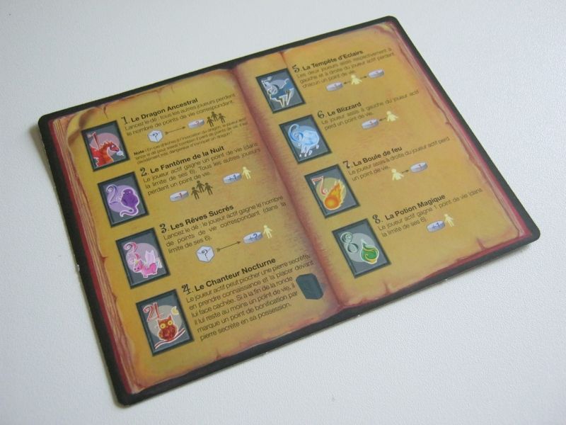 Sur des aides de jeu représentant un grimoire ouvert, vous pourrez retrouver l'ensemble des pouvoirs que pourront vous conférer les pierres magiques. Perte de points de vie, gain ou échange, mais aussi pioche de nouvelles pierres qui serviront de bonus, voici un échantillon des différents pouvoirs que vous pourrez utiliser en découvrant la bonne pierre parmi les vôtres, après l'avoir déposée sur le plateau de jeu.