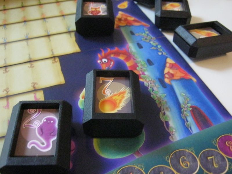Le plateau parlons-en. Sur celui-ci vous viendrez déposer les bonnes pierres que vous aurez réussi à découvrir, en donnant un chiffre correspondant aux pierres que vous avez devant vous face cachée. Mais comme vous avez pu vous en rendre compte, tous les chiffres ne comportent pas le même nombre de places. Le chiffre 1 (le dragon ancestral), qui permet de faire perdre des points de vie aux autres joueurs selon le nombre tiré au dé, n'existe qu'en unique exemplaire. Tandis que le 8, la potion magique qui permet de regagner un point de vie, est présente 8 fois dans le jeu. Il y a corrélation entre le chiffre et la quantité de tuiles présente avec ce nombre. Selon le nombre de joueurs, il sera posé, en début de manche, un nombre différent de pierres sur le plateau, face visible, afin de posséder quelques éléments de déduction d'entrée de jeu.
