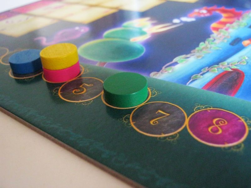 En bas de celui-ci vous retrouverez 8 emplacements qui serviront à marquer votre score, et à remporter la victoire. Les points se comptant en fin de manche. Le gagnant marque 3 points, le perdant aucun et les autres 1. Si la manche se termine sur la mort d'un magicien, on applique le même barème. Si un joueur gagne en ayant invoqué toutes ses pierres, les autres joueurs ne gagnent rien. Si un joueur se tue, les autres marquent 1 point. A ceci on ajoute les potentielles pierres secrètes piochées durant le tour.
