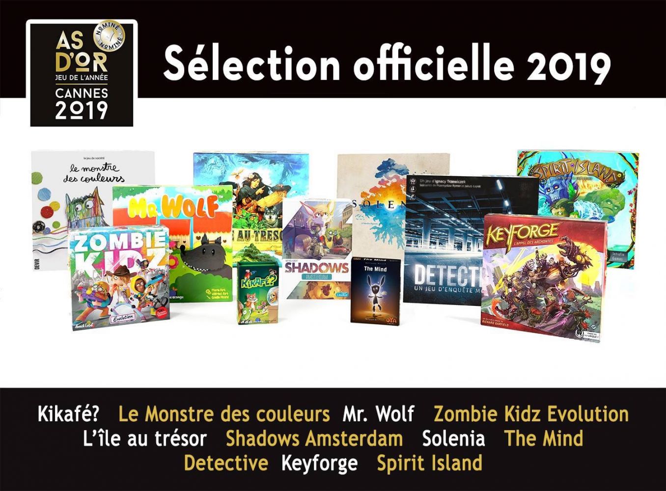 - Les jeux nominés pour l'As d'Or-Jeu de l'Année : L'île au trésor, Shadows Amsterdam, Solenia et The Mind.