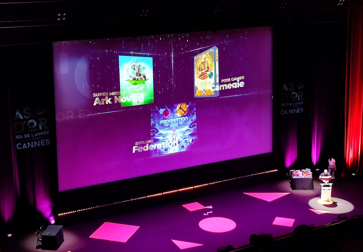 La remise des As d'Or avait lieu ce jeudi 23 février dans le grand Auditorium Louis Lumière du palais des efstivals de Cannes et l'équipe de Jedidsjeux a eu la chance et le plaisir de pouvoir y assister. Et cette année les québecois d'Es-Tu Game ? ont pu enfin tous faire le déplacement pour assurer la présentation de la cérémonie dans une ambiance pleine de bonne humeur et surtout pleine d'humour comme il se doit quand les trublions ludiques sont là !