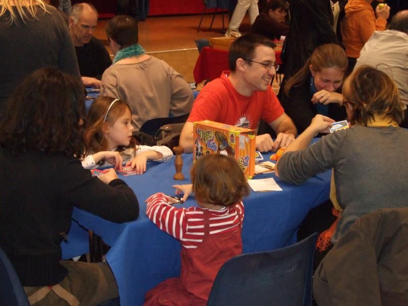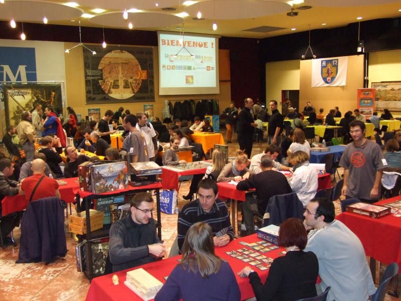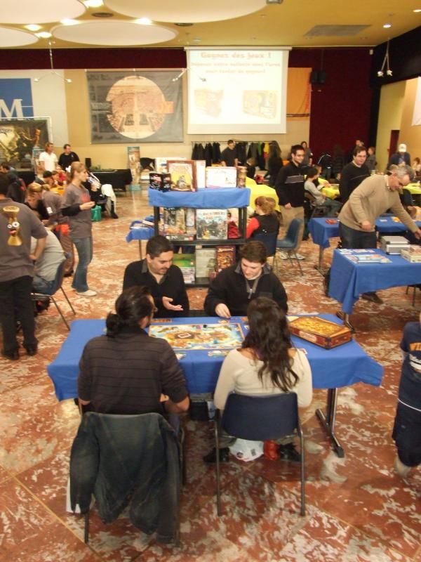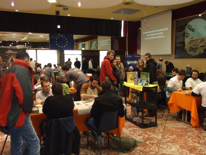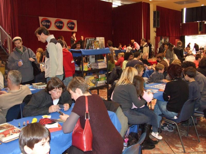 Et la salle commence sérieusement à se remplir. On se précipite pour trouver une table avec un jeu installé, prêt à jouer. Les organisateurs doivent d'ailleurs sortir d'autres tables assez rapidement et y installer des jeux réclamés par certains visiteurs. J'avale rapidement un sandwitch, une barre chocolaté, une boisson, et je commence à mitrailler avec mon appareil photo tous ces gens venus passer un bon moment ludique....