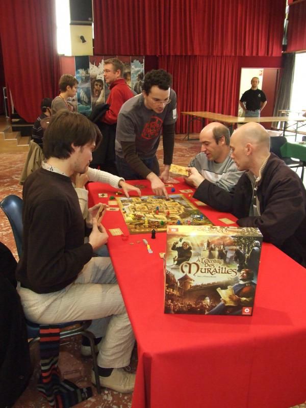 "A l'ombre des murailles"...ah, mais je vois des visages familiers autour de cette table...mais oui, ce sont bien Messieurs Palferso et Tyrion, avec deux autres partenaires, qui se font expliquer par un GO d'Asmodée les règles du jeu. Diantre, il étaient là des l'ouverture alors ! Je me demande même s'ils n'ont pas campé devant la mairie pendant la nuit...