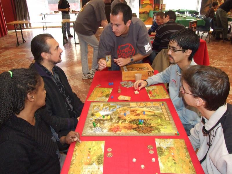 Cette photo pour vous montrer que monsieur Mkazoo, animateur du tournois de Colons de Catane, avait consacré sa matinée à expliquer d'autres jeux...comme ici L'age de Pierre. Admirez un peu la gestuelle d'un "expliqueur" en chef...raaah ! c'est beau !