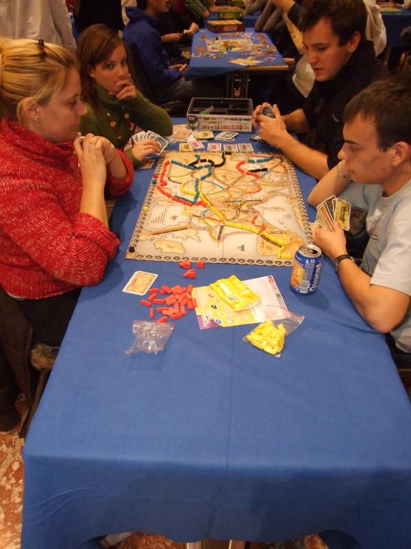 Alors il faudrait pas oublier non plus que dans Asmoday, il y a Day...comme Days of wonder (DOW pour les intimes). Et naturellement, étaient présents en permanence sur 2 ou 3 tables l'un des jeux les plus populaires de cet éditeur, Les aventuriers du rail....ici la carte de l'Europe, mais on pouvait joué aussi sur le plateau US et Suisse.
