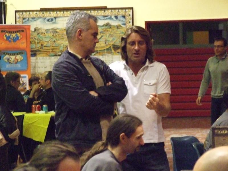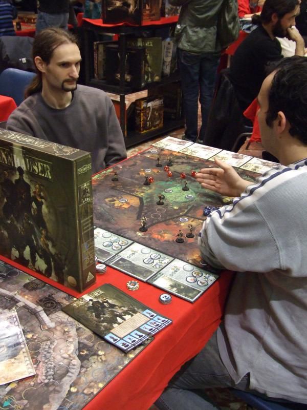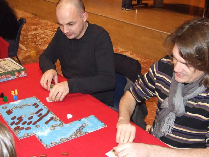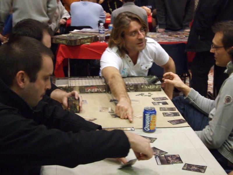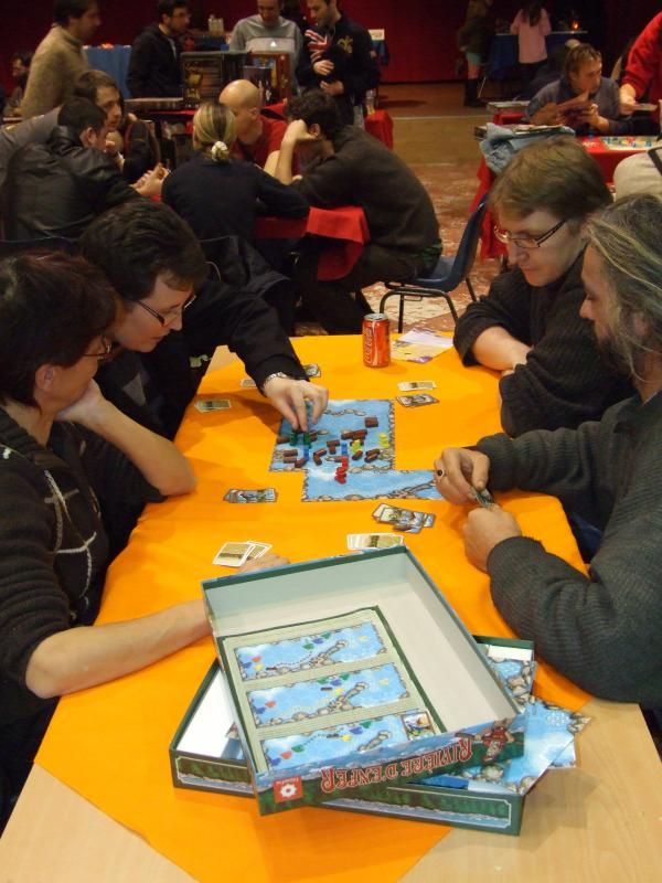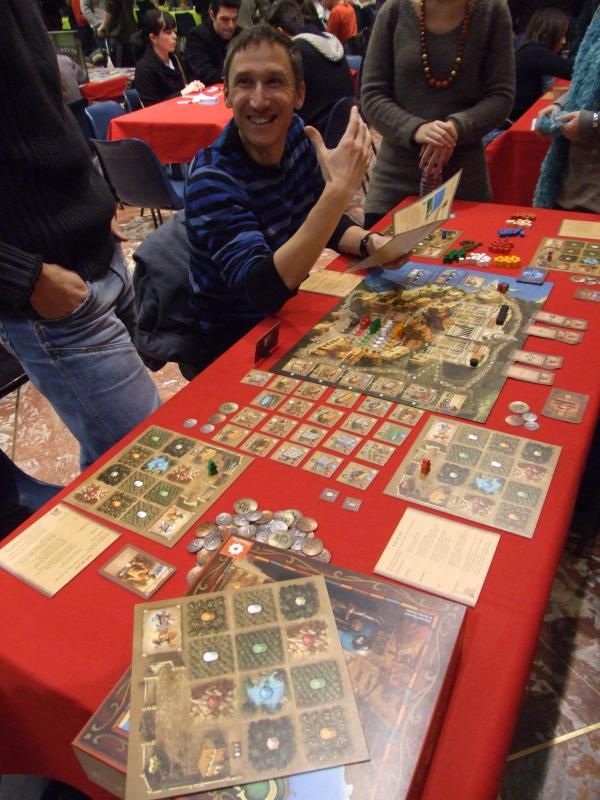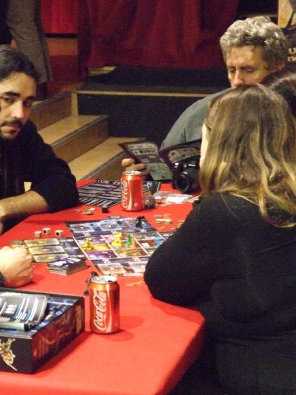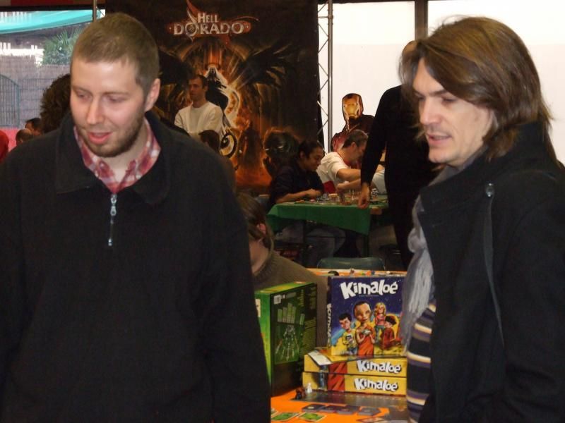 Té ! Qu'est-ce que je vous disais ! Et nous retrouvons monsieur Unkle à une table où va commencer une partie de Rivière d'enfer...oui parce que les jeux traduits par l'éditeur Filosofia étaient aussi très bien représentés. A la droite de monsieur Unkle, laissez-moi vous présenter monsieur Patrice, qui s'occupe (avec mademoiselle Michelle) de la boutique de jeux "Lud'm" dans laquelle nous trouvons les jeux que nous aimons. Monsieur Patrice est aussi celui qui a beaucoup œuvré pour que la caravane de l'Asmoday passe par chez nous...