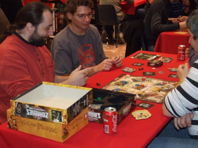 Après m'être carapaté sans demander mon reste, je décide de poursuivre mon petit tour autour des tables...ici, une partie de Zombies. Le monsieur en rouge à gauche travaille à la Baraka-jeux ("Hello Jef !"), un haut-lieu ludique bien connu des gamers d'ici, et même d'ailleurs.