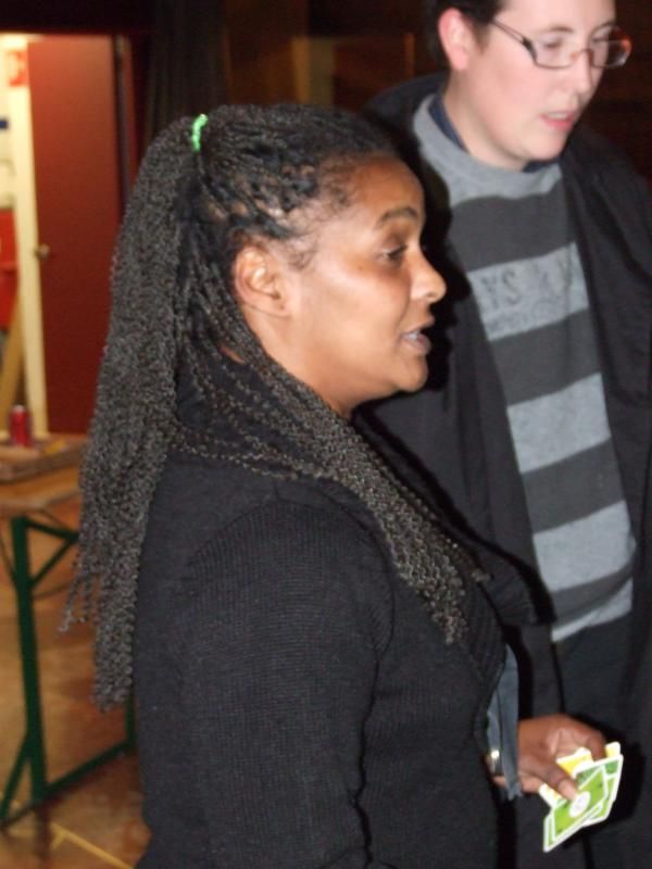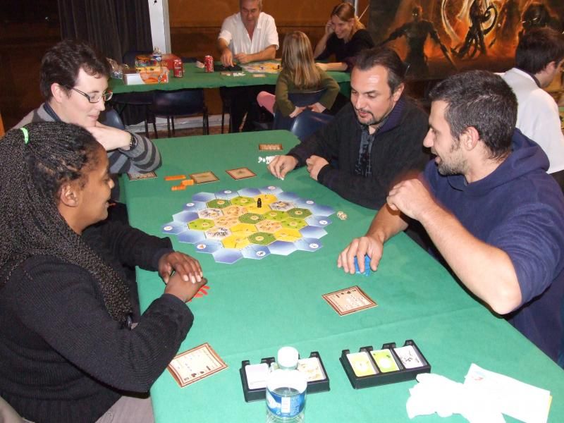 ....et ben une winneuse en fait ! La dame ne cessait de bouger ce qui fait que j'ai pas pu prendre une seule photo de face. Faut dire qu'elle est en train d'expliquer aux trois messieurs comment, avec une technique sans faille et des nerfs solides, on peut gagner un tournoi de Colon de Catane...non mais ! Sa victoire fut serrée tout de même...elle gagne avec 3 villes, la tuile chevalier et deux cartes point-victoire, alors qu'un des joueurs avait 9 points depuis un moment.