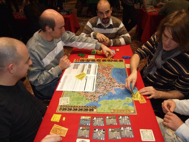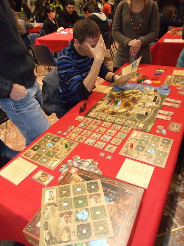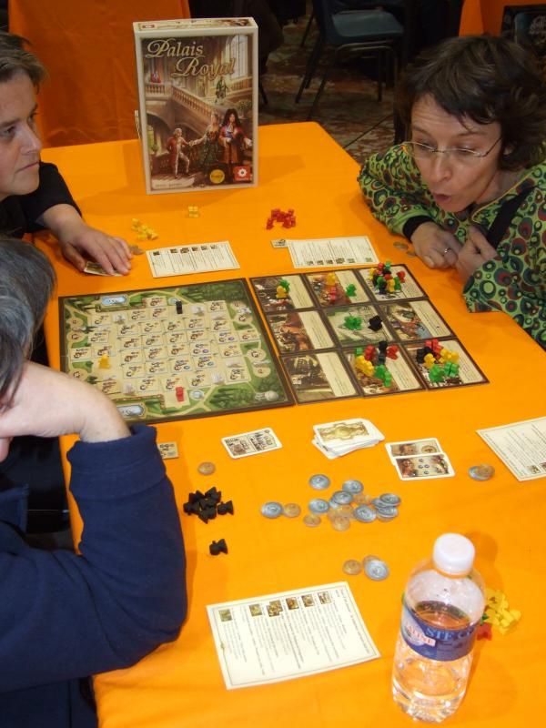 Hou lala ! C'est qu'il y a beaucoup de monde maintenant, les tables sont prises d'assaut. Je suis parvenu à disputer une partie de Palais Royal que je n'ai d'ailleurs pas immortalisé. Cela dit, ce jeu a pas mal tourné...bon, je vais me reprendre quelque chose à grignoter moi.