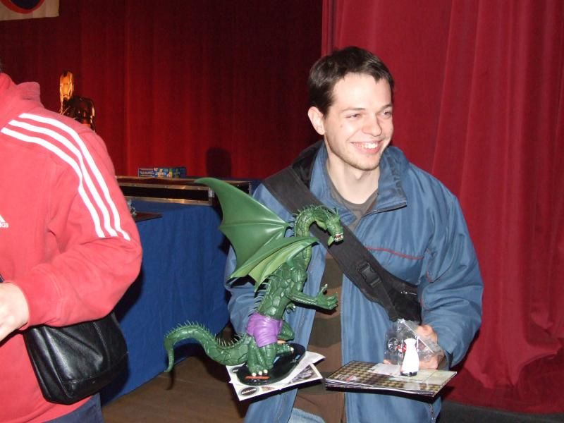 Ce souriant jeune homme vient de finir second au tournoi d'Héroclix (enfin je crois, j'étais un peu perdu avec tous ces tournois)...il repart quand même avec figurine et décors de jeu. Bravo !