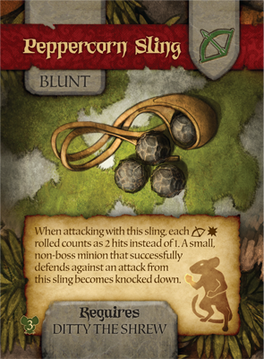 Son arme de base, "Peppercorn Sling" ("Fronde à Poivre"), vous permet, quand vous attaquez avec cette fronde, que les dés indiquant "arc + *" comptent pour deux touches au lieu d'une. De plus, un petit monstre (qui n'est pas un boss) qui réussit à esquiver parfaitement l'attaque se retrouve assommé.