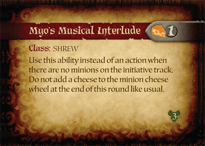 Les capacités de la musaraigne sont uniques, dans le sens où elles affectent tous les monstres et/ou toutes les souris présent(e)s sur la tuile. Par exemple, "Myo's Musical Interlude" ("Interlude Musical de Myo"), permet de ne pas ajouter de fromage sur la meule quand il n'y a pas de monstre sur la pile d'initiative. Pour ce faire, Ditty doit utiliser cette capacité au lieu de faire une action. Les héros peuvent donc plus facilement passer un tour à chercher des objets, sans être menacés par la meule. Et cette capacité ne coûte que 1 fromage.