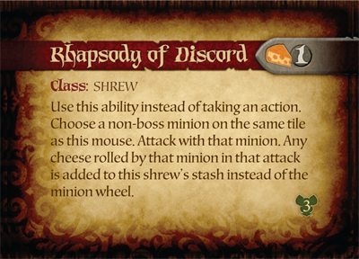 Cette capacité est d'une grande utilité pour le groupe, mais il semble que "Rhapsody of Discord" ("Rhapsodie de Discorde") l'est encore plus vis à vis des rencontres. Lorsque Ditty joue cette mélodie, tous les monstres non-boss vont attaquer en son nom! Que le monstre soit enchanté par la merveilleuse mélodie de Ditty ou exaspéré par son manque de talent musical n'est pas important. Cependant, lors de son attaque, tous les fromages qu'ils obtiendront sur les dés iront dans les poches de Ditty au lieu d'aller sur la meule. Par contre, une fois de plus, Ditty doit utiliser cette compétence au lieu d'effectuer une action.