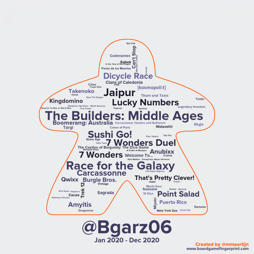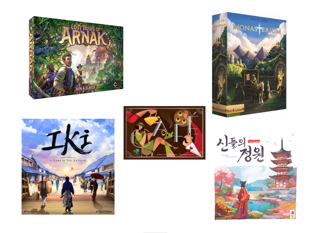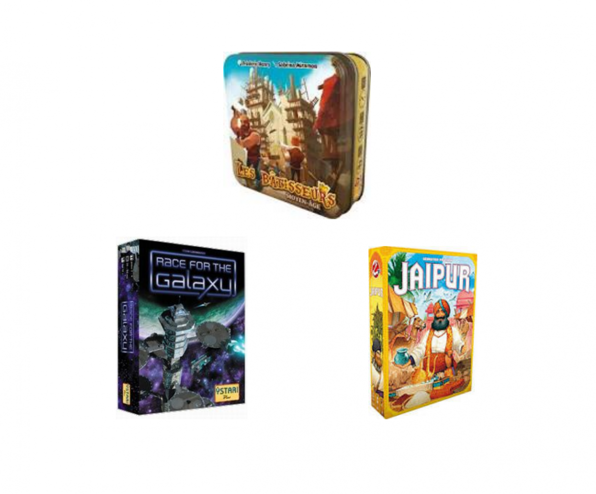 Sur mon podium on note dans l’ordre d’arrivée Les Bâtisseurs Moyen-Age, Race For The Galaxy et Jaïpur suivi d’un peu plus loin de 7 Wonders, Carcassonne, Amyitis voire de l’un peu plus récent 7 Wonders Duel.