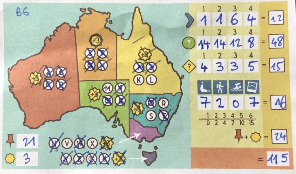 Chaque carte représente également un site touristique (soit une lettre de l'alphabet, soit un caractère spécial). Les sites touristqiues sont divisés sur la fiche de score en 7 régions : les 6 états d'Australie et le Territoire du Nord) contenant chacun 4 sites.Chaque joueur coche, raye ou colorie (c'est comme il préfère !) la case correspondante aux cartes qu'il pose au fur et à mesure de la manche. A noter que le ou les premiers joueurs qui parviennent dans le même tour à cocher les 4 lettres d’une province gagnent les 3 points bonus de la province (les autres joueurs rayent le bonus qui n'est plus accessible).