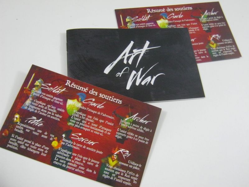 Art of War est un jeu étonnant. Sous ses airs de petite boite on s'attend à un petit jeu simple et rapide : il n'en est rien ! Comptez près de 30/45 minutes pour vos premières parties car le jeu est tout sauf simple à assimiler. Le jeu propose un grand nombre de possibilités et une véritable profondeur tactique. Art of War est à réserver à un public de joueur avertis, mais l'essayer c'est l'adopter, pour ceux qui aimeront la possibilité de customiser leur deck à volonté ou pour les autres pour des parties tactiques mais rapides (après quelques parties ;) ) En plus les illustrations sont de toute beauté ce qui ne gâche en rien l'envie d'y retourner. On regrettera juste l'absence de plateau ou tapis de jeu, qui rend difficile la visualisation des zones de jeu lors des premières parties, mais je suis sûr que certains proposeront un goodie pour cela prochainement :)