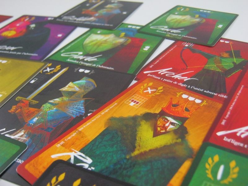 Il me semble important de vous évoquer succinctement les règles afin que vous compreniez mieux les cartes par la suite. Nous sommes devant un jeu d'affrontement à 2 joueurs, dans lequel il vous faudra soit avoir le plus de citoyens dans son royaume, soit capturer ou tuer le roi adverse, soit avoir la majorité sur les 4 types de citoyens, soit enfin amener l'autre joueur à ne pas pouvoir conscrire 2 unités dans sa zone de bataille. Chaque joueur va donc devoir gérer son royaume, son champ de bataille avec ses unités et sa réserve d'où les cartes pourront exercer leurs pouvoirs avant d'entrer en jeu.