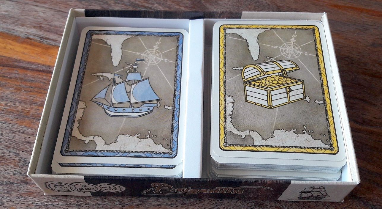 Brigantin propose un jeu au thème fort : la piraterie et à la mécanique très simple : on choisit entre rester à terre (pour recruter des membres d'équipage) ou prendre la mer (pour partir à l'abordage). Ensuite le hasard de la pioche fait le reste, on pourra rencontrer de petits bateaux faciles à attaquer mais rapportant peu de points de victoire, ou bien des gros bateaux qui nécessiteront une forte puissance de feu mais feront perdre des membres d'équipage mais qui rapporteront beaucoup de points. Il ne faudra pas négliger les cartes action que l'on obtiendra pour chaque jour en mer ou en payant à terre et qui permettront d'obtenir des bonus ou (surtout) de faire des misères aux autres pirates. Ajouter quelques événements qui seront connus à l'avance et que l'on pourra déclencher en jouant suffisamment d'actions et on obtient un mélange simple mais original.