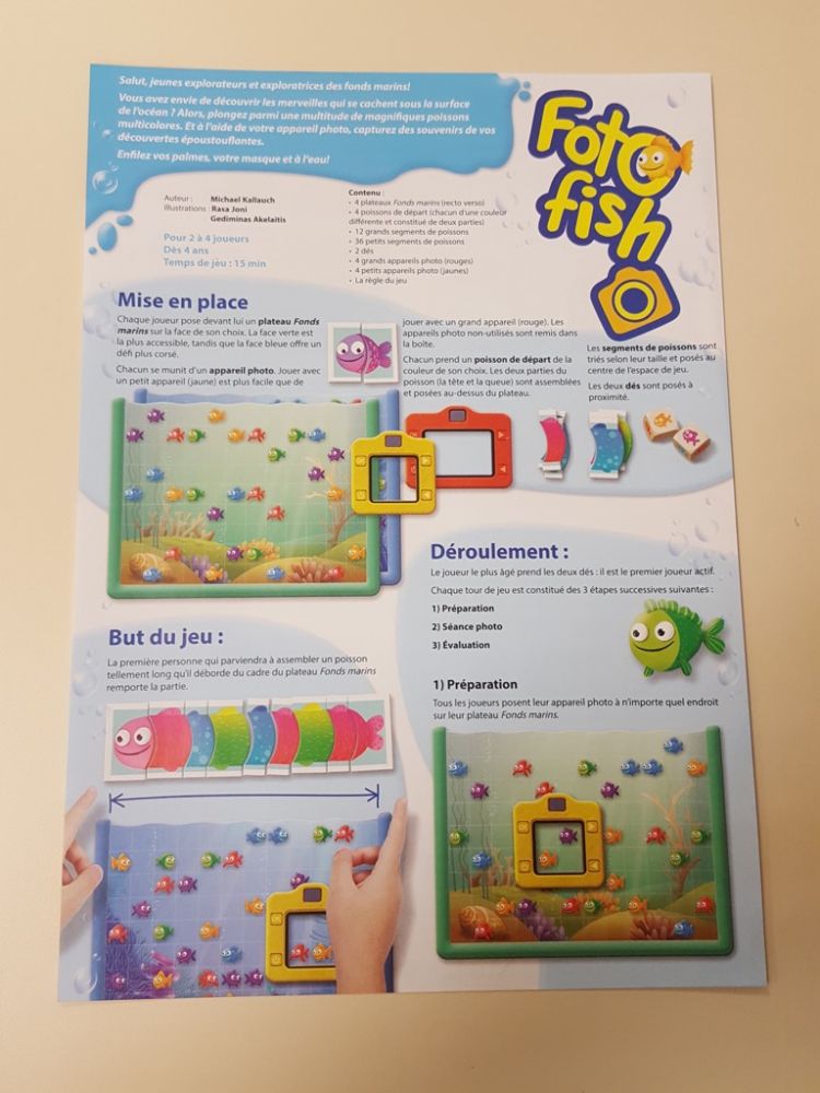 Foto Fish est un jeu pour enfants accessible à partir de 4 ans pour des parties rapides d'une quinzaine de minutes. Présenté comme un jeu d'observation et de rapidité, il demande aux petits joueurs d'observer des poissons dans des fonds marins et de prendre des photos avec un appareil photo en carton.