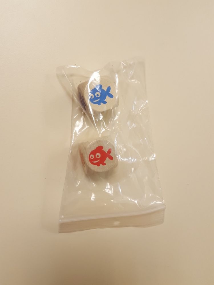 Deux dés à 6 faces avec les 5 couleurs de poisson : bleu, orange, vert, violet, rouge et une face vide.