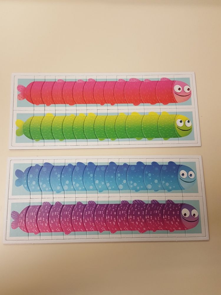 Les petits joueurs peuvent rassembler les poissons obtenus pour en comparer la taille (attention à la manipulation sur la table, on a souvent des accidents et il faut refaire son poisson). Quand les joueurs autour de la table en sont capables, il est préférable de leur faire compter les segments de poisson, ça leur permettra de travailler la comptine numérique jusqu'à presque 15 (parfait pour des 4 ans) et de comparer des quantités.
