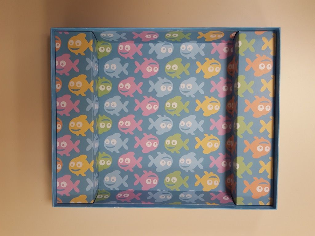 Le fond de la boite est en carton, c'est classique mais ici il est illustré de petits poissons. Plutôt bien vu !