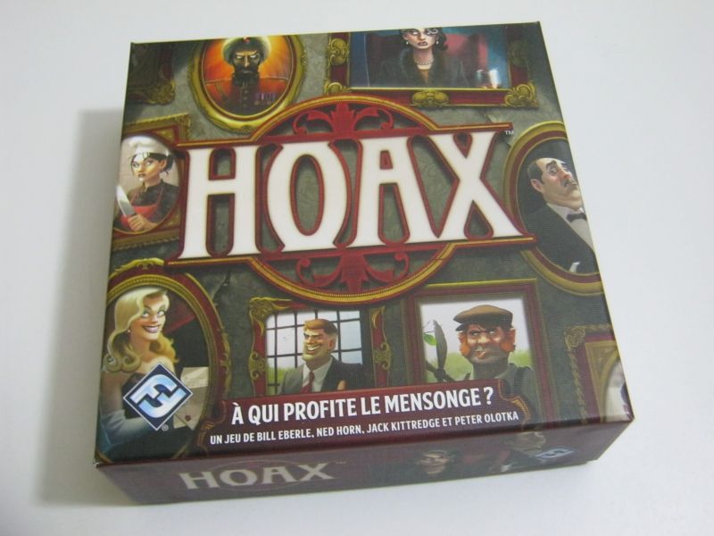 Hoax fait parti de ces jeux au matériel minimaliste et proposant une mécanique de découverte d'identité et de bluff. Un jeu dans la lignée de Complot, Vérone ou Love Letter, le tout dans une ambiance proche de Cluedo. Si vous n'arrivez pas à cerner le jeu avec ces références, je ne saurai trop vous inviter à visiter notre site pour les découvrir, car ils valent le détour. Bref, revenons à notre jeu. Dans cette boite carrée de petit format, vous retrouverez des pions, des cartes et des fiches. Et moi je m'en vais vous présenter tout ça.