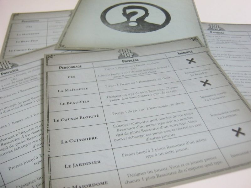 Il en existe de 2 sortes : les pions imposteur qui vont être donné aux joueurs ayant fait de fausses revendications, et qui serviront à rendre caduc le pouvoir de ce personnage pour la personne ayant menti. Les autres pions ce sont les ressources, qui sont l'argent, la renommée et les preuves. Ils serviront à enquêter, car pour utiliser cette action il faudra dépenser une ressource de chaque.
