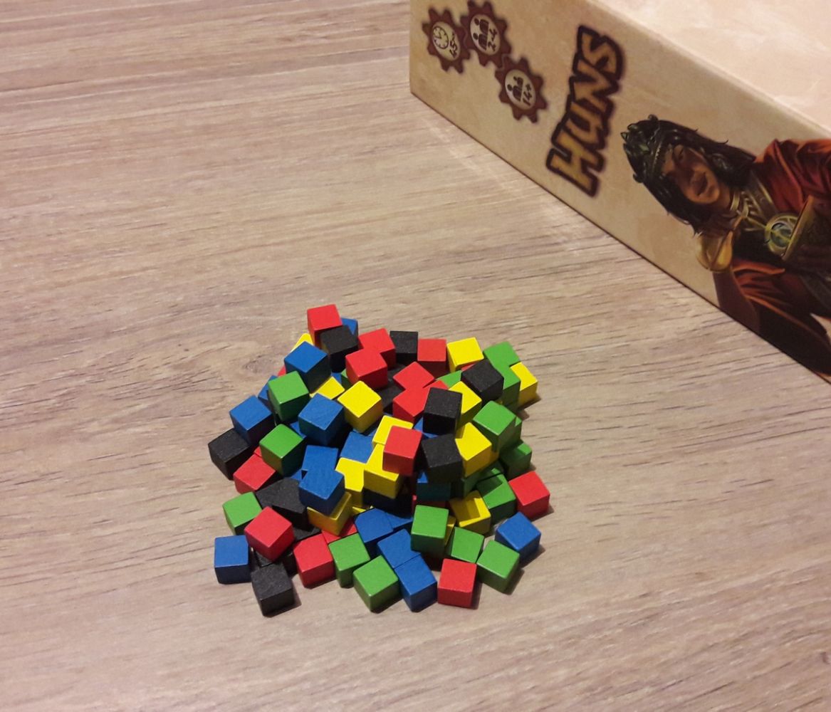 Au cours de la partie les dés représentent les opportunités de pillages dans les 5 catégories de ressources ou le nombre de cartes de la couleur correspondante que l'on peut regarder avant d'en choisir une.