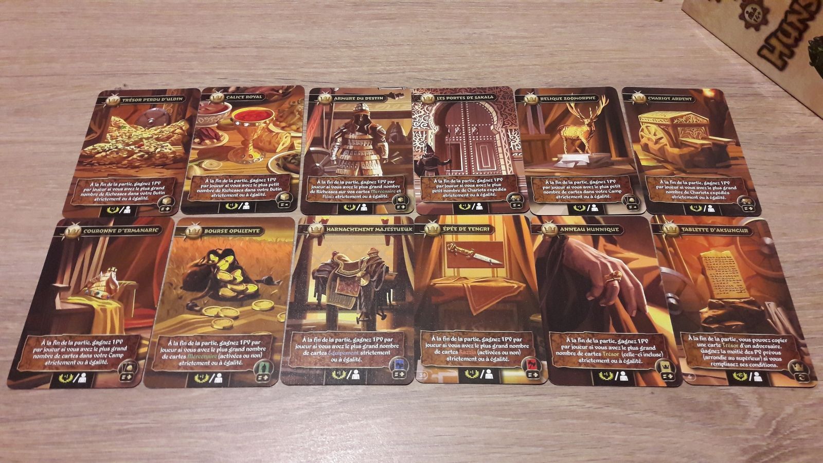 Les cartes Trésor n’ont pas d’effet pendant la partie mais permettent de gagner des PV en fin de partie si leur condition de victoire est atteinte.