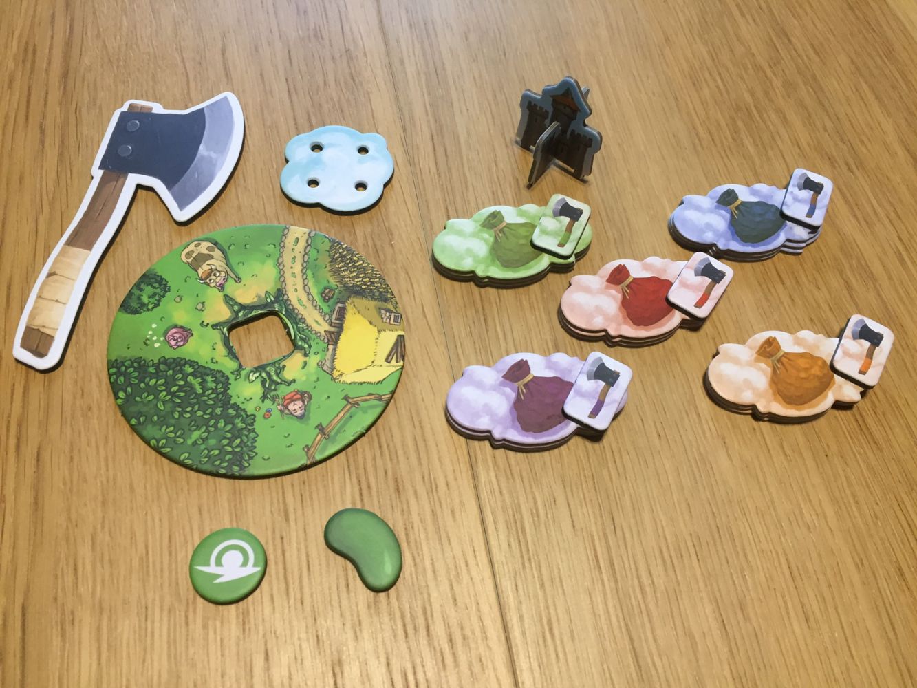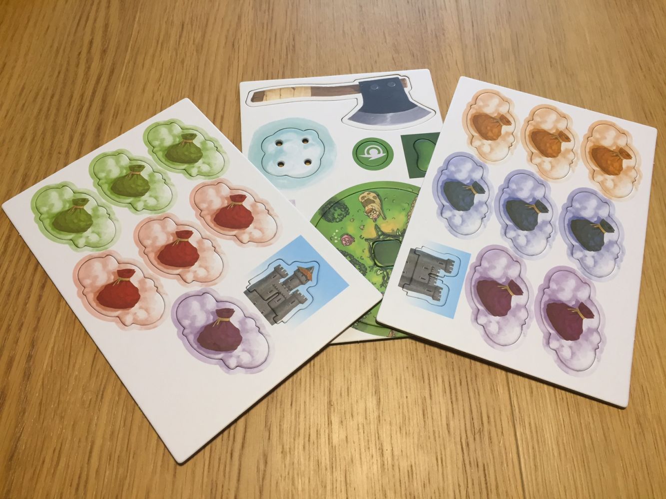 Il y a donc bien cinq setup joueurs, avec des cartes, un petit token hache et trois nuages en carton.