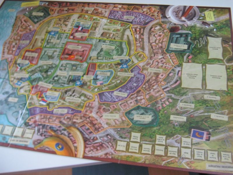 Commençons par le plus gros morceau : le plateau. Découpé en plusieurs zones, délimitées par des frontières, dont les quartiers, les casernes militaires, le commissariat de police, les ambassades et points stratégiques. Vous retrouverez aussi le parcours politique en haut du plateau, le parcours de coup de l'autre côté, tandis que la défausse, l'aide étrangère et la pioche sont sur le côté gauche. Ce plateau qui représente la capitale dispose de nombreux lieux bien utiles dans le jeu. Il ne sera utilisé que lors des coups d'État.