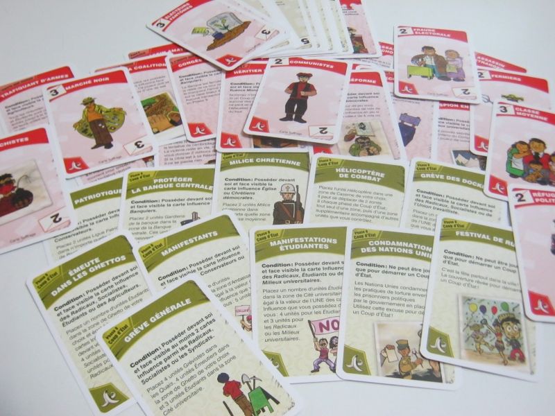 Séparées en 3 types, les cartes Suffrage et Influence permettent d'apporter des voix aux joueurs lors des scrutins. Elles permettront aussi de payer des pots de vin, ou carrément d'engager des assassins. Tandis que les cartes Action vont avoir un effet immédiat et temporaire.