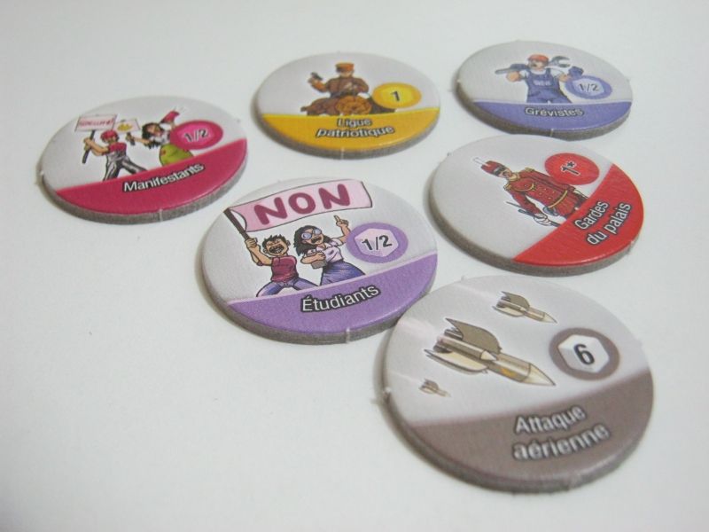 Les pions vont principalement servir lors des coups d'État où le plateau est alors utilisé. Représentant les unités de chaque troupe lors des manœuvres sur le plateau. Les marqueurs Contrôle permettent de donner ou d'échanger des unités librement avec les autres joueurs.