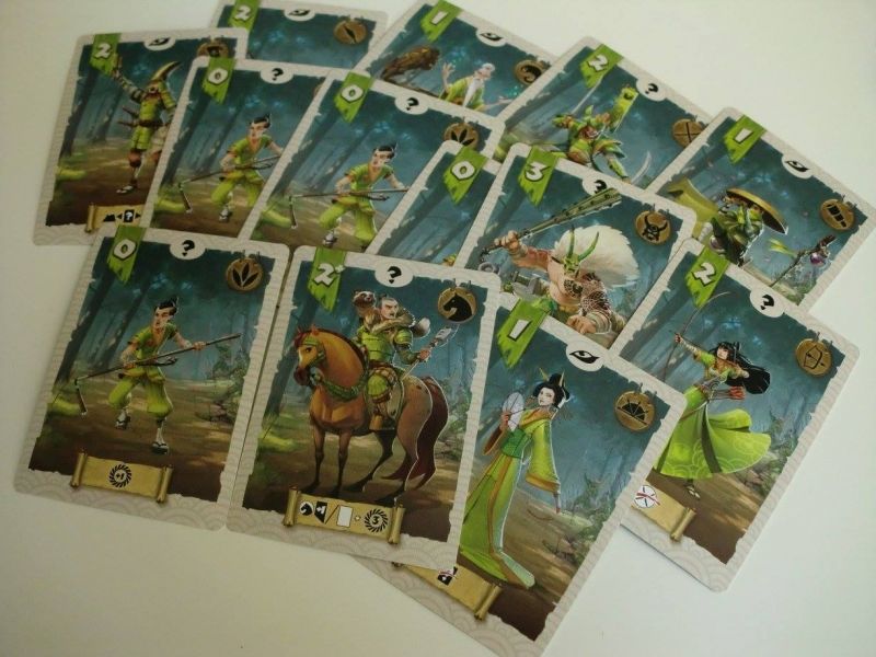 Dans Kenjin vous représenterez un clan parmi les 4 que l'on vous propose et qui sont : le clan Kamiwashi (blanc), le clan Jozu (bleu), le clan Yaseï (vert) et enfin le clan Hondo (rouge). En fonction du clan choisi, les joueurs vont prendre les 12 cartes correspondantes, et le seigneur à cheval. Chaque paquet contient les mêmes factions, seule la couleur et le décor changent en fonction des clans. En haut de ces cartes sont disposés 3 symboles. À gauche la puissance de l'unité, au centre l'icône de la faction selon qu'elle soit régulière ou secrète, et enfin à droite le type d'unité. Tout en bas vous trouverez la capacité spéciale représentée par une icône. Je vous propose donc de décortiquer maintenant l'ensemble de ces cartes dans le paragraphe suivant.