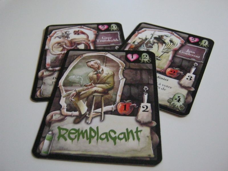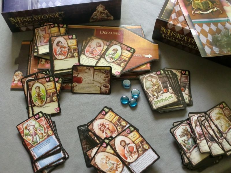 Un petit aperçu d'une partie en cours. Comme vous pouvez le voir, la santé mentale part vite si on ne fait assez attention. Il faut donc maximiser ses chances et surtout bien réfléchir. Ils ne sont pas mignons ces professeurs et ces gentilles jeunes filles innocentes ? (non je ne suis pas folle, j'ai perdu un peu de santé mentale c'est tout!) Voilà vous avez eu un petit aperçu du contenu de la boite. Miskatonic est un jeu de deck building léger et revanchard et cela quelque soit la configuration, seul bémol l'optimisation n'est pas au rendez-vous et peut frustrer certains joueurs. Le thème lui aussi reste assez plaqué, mais franchement ça ne gêne pas plus que cela et surtout vous passeriez à côté d'un excellent moment en n'y jouant pas.