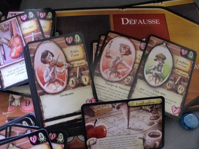La boite est de belle taille, pour un jeu de deck building, cette taille s'explique facilement par la présence des plateaux de joueurs, nous y reviendrons plus tard, mais aussi du nombre de cartes, 198 au total réparties dans différentes catégories. Nous y retrouvons la classe de départ, les étudiantes très charmantes, le personnel du lycée, charmant également à leur manière, les cartes nouvelles élèves, les remplaçants, les cartes de résumé et des cartes vierges pour faire vos propres cartes.