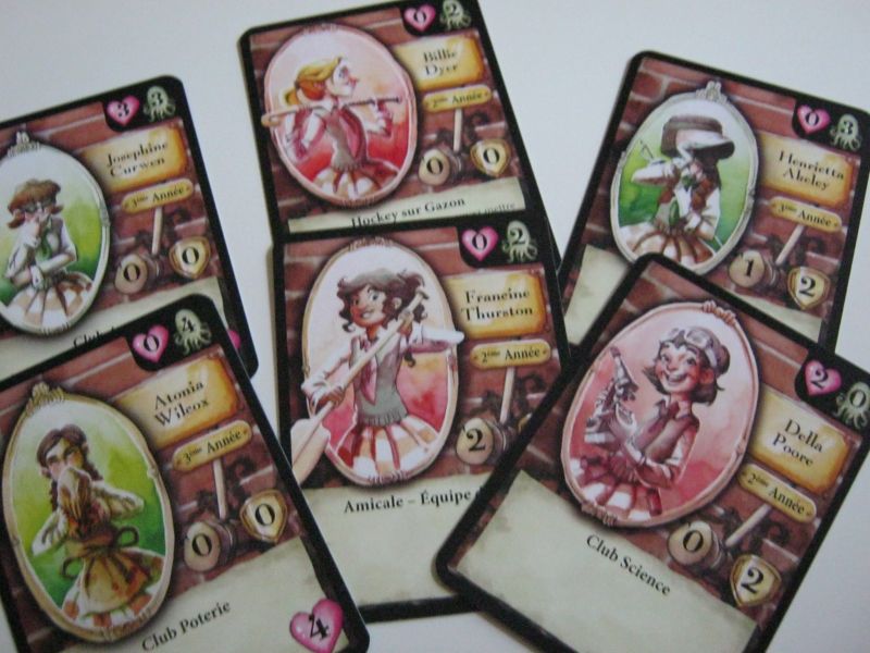 Les plateaux sont composés de deux parties à assembler, le tout représentant une crosse de croquet, sur lesquelles figurent la pile d'achats, la pioche, la salle de classe et la défausse ainsi que votre indicateur de santé mentale. Les cartes sont assez variées et bien illustrées. En effet, les illustrations sont jolies, bien détaillées et avec un aspect graphique très personnel, ce qui donne un côté particulier au jeu qui lui sied à merveille.