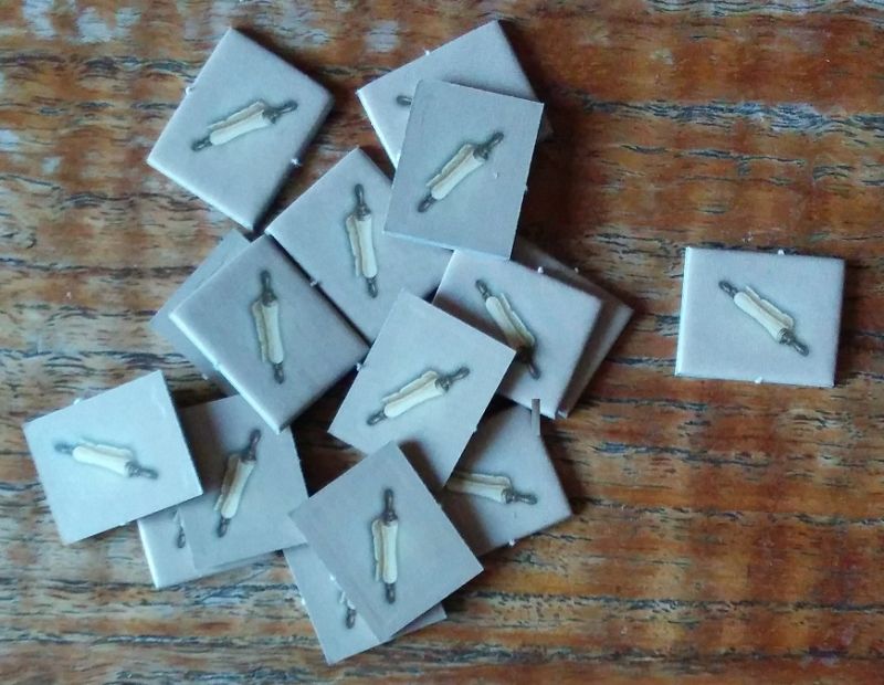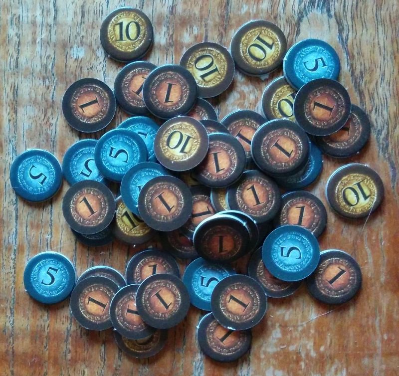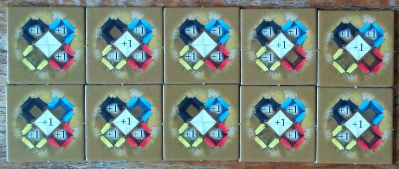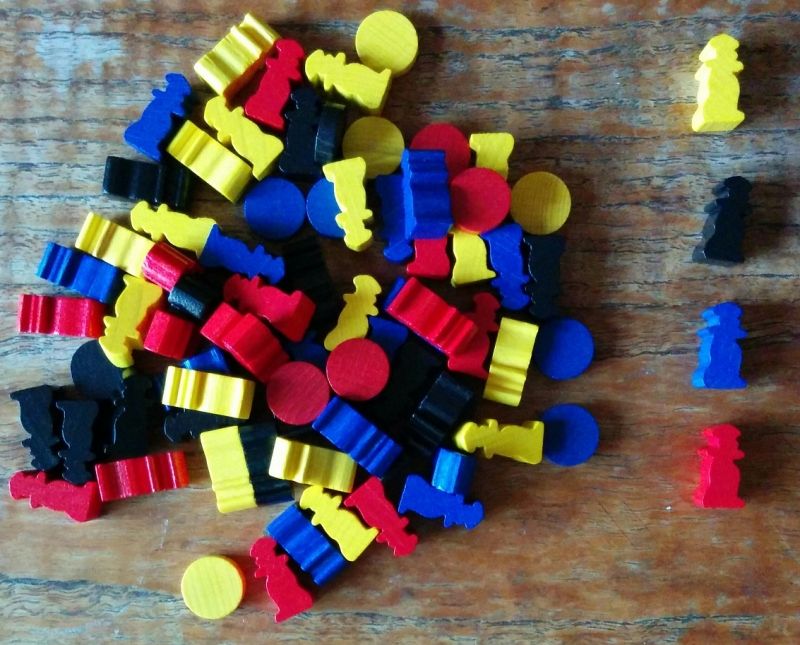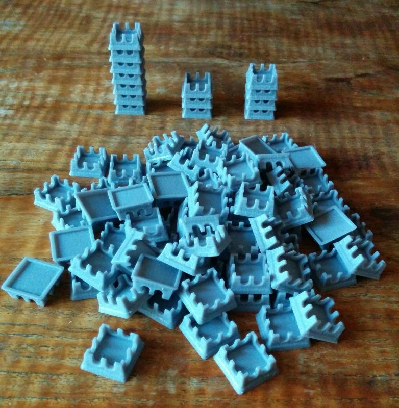 Grises au départ, elles prennent instantanément de la couleur en étant placées au Marché : noir, bleu, rouge, jaune ou blanc. On les empile pour poser des éléments de construction plus haut rapportant davantage de points. Elles sont empilées à l'envers sur la photo mais pourquoi pas après tout, ça leur donne un petit côté pagode / fortification !