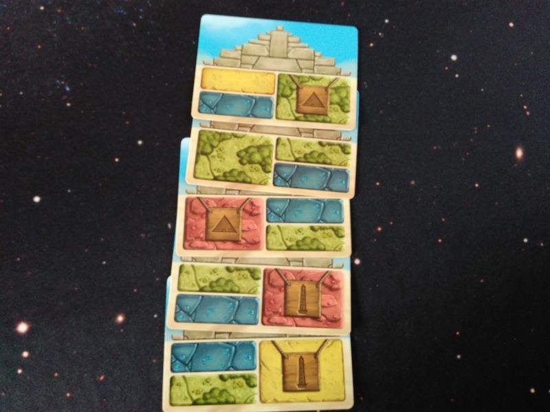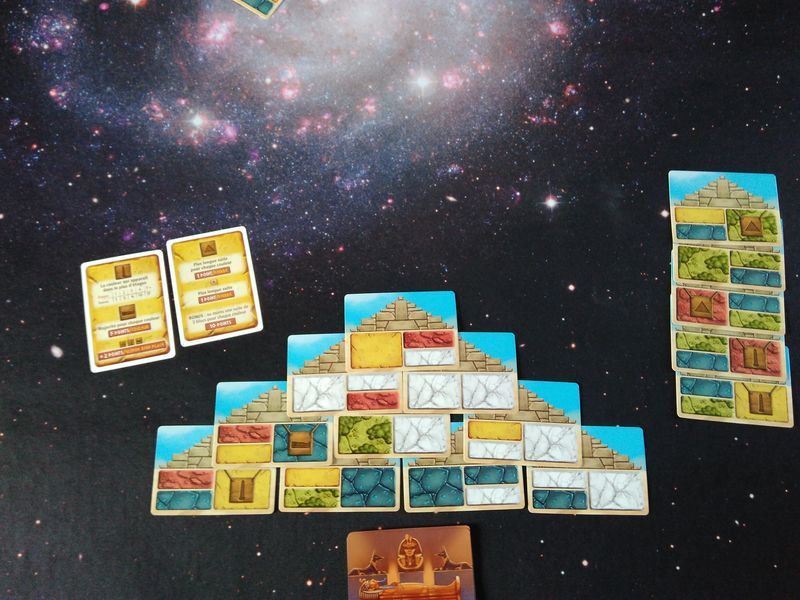 Une fois que les tuiles dieux ont été récupérées, le joueur dont c'est le tour prend une paire de cartes et en pose obligatoirement une sur sa pyramide, de façon à former quelque chose ressemblant à l'image du dessus en 10 tours.
