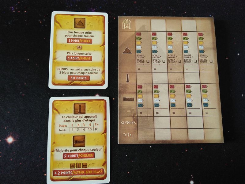 A ces scores, on ajoute les glyphes (icônes sur les cartes) qui rapportent 2 points s'ils sont présents dans la bonne construction.