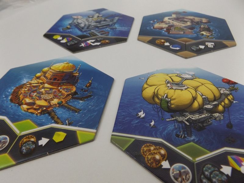Le jeu ne possède pas de plateau, mais des tuiles qui sont des îles sur lesquelles vous allez effectuer vos déplacements. Chaque couleur possède 2 tuiles : une active si la couleur est jouée par un joueur, et une seconde inactive si cette couleur n'est pas jouée. Le nombre de tuiles non actives diffère selon le nombre de joueurs. Leur point commun étant qu'une fois explorées on les retournent, toutes possédant le même dos marqué d'une croix rouge.