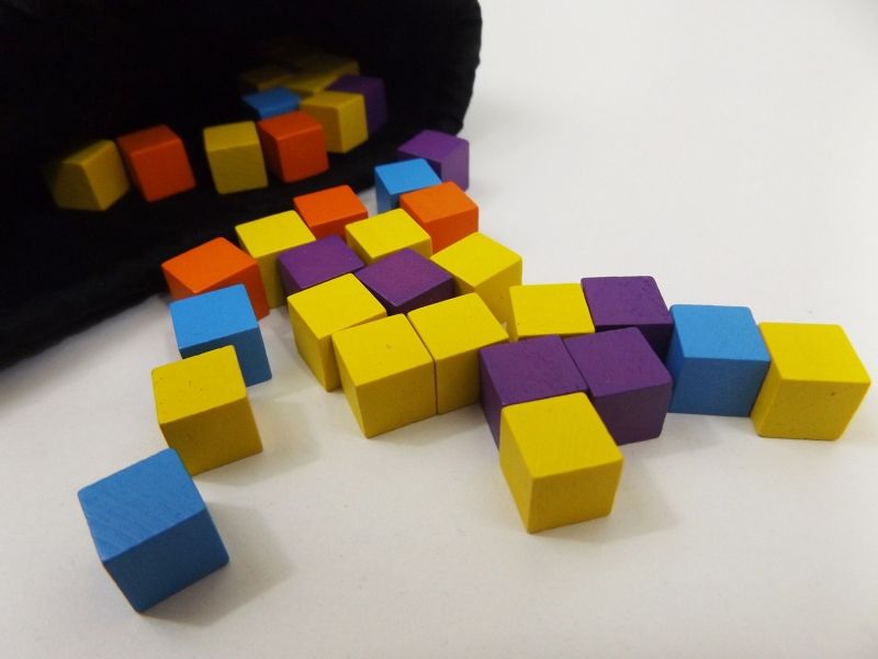Ces cubes seront indispensables pour construire votre dragon. Ils sont de 5 couleurs différentes. Bleus, oranges et violets serviront de matériaux de construction, tandis que les jaunes seront plutôt de monnaie, et enfin le blanc qui est unique représente la larme de Ryu. En début de partie et en tenant compte du nombre de joueurs, on placera un certain nombre de cubes dans le sac noir ; Il servira pour la pioche des cubes lors des répartitions entre joueurs.