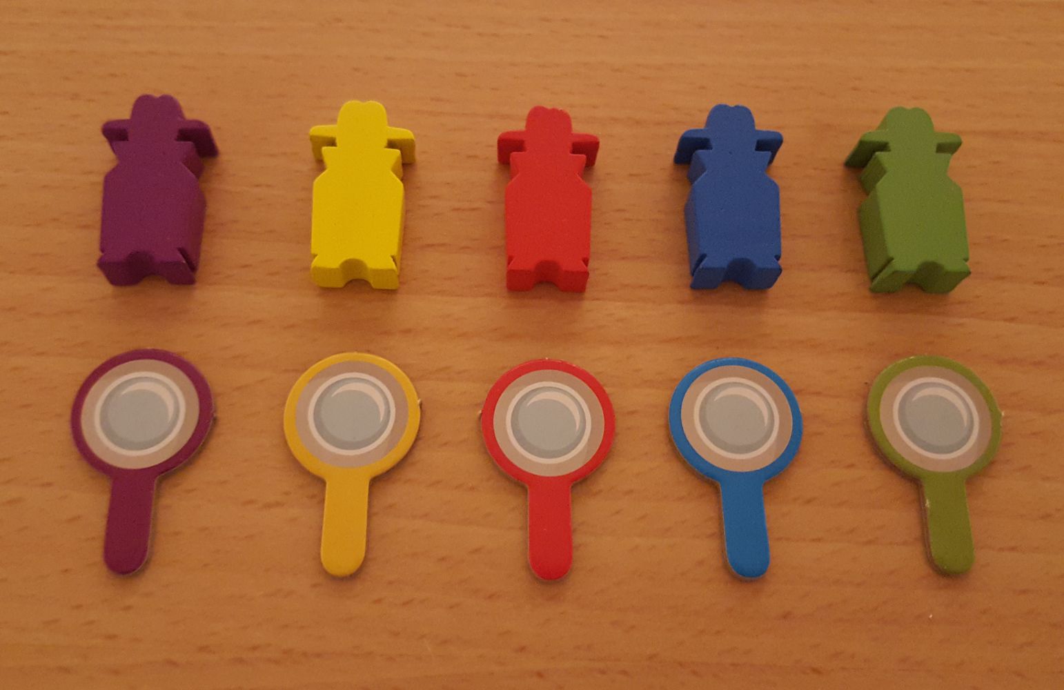 Les 5 pions Détective et les 5 marqueurs Couleur des joueurs.