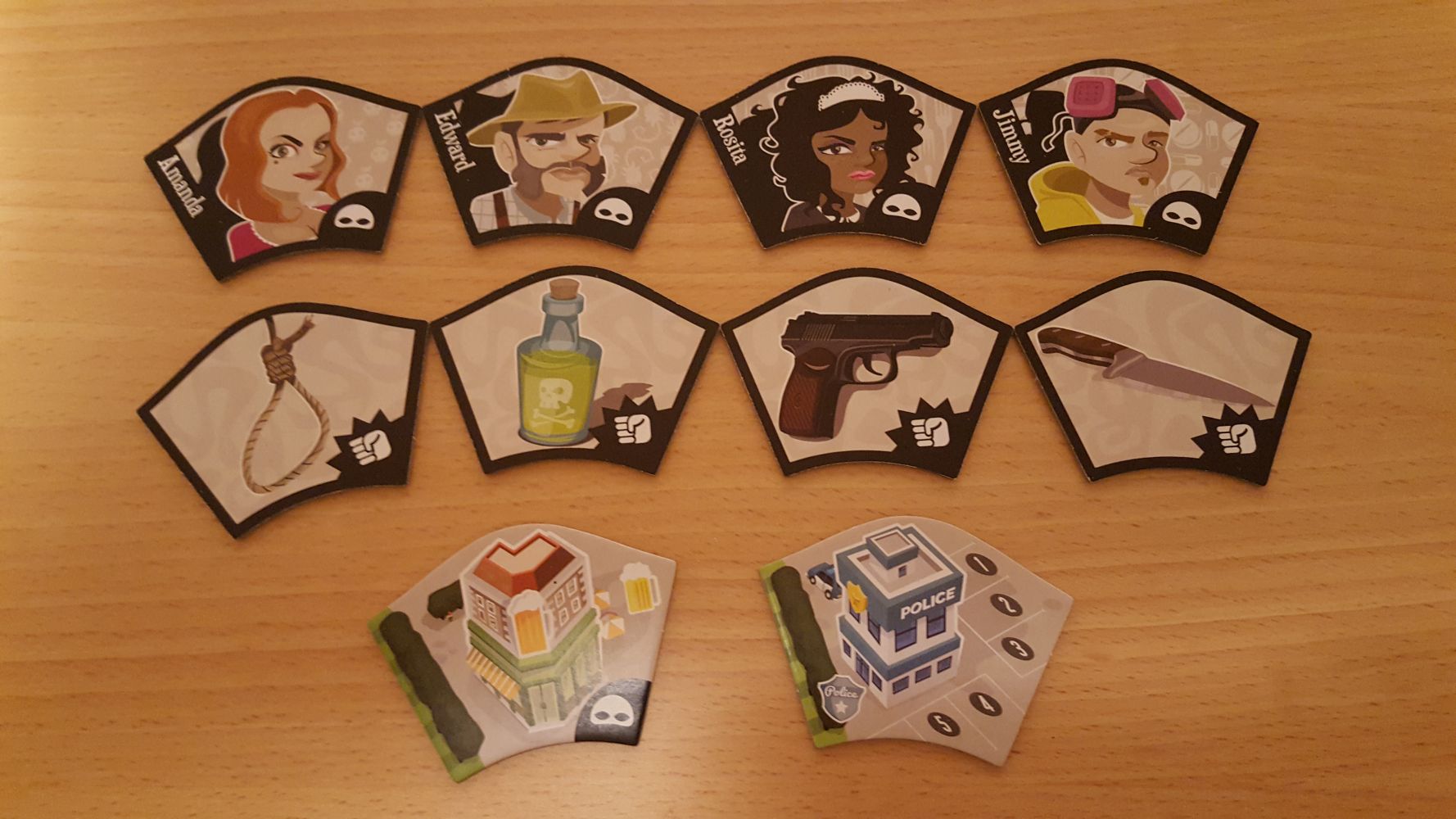 De haut en bas : les 4 tuiles Maison/Suspect, les 4 tuiles Maison/Arme, la tuile Pub et la tuile Police.