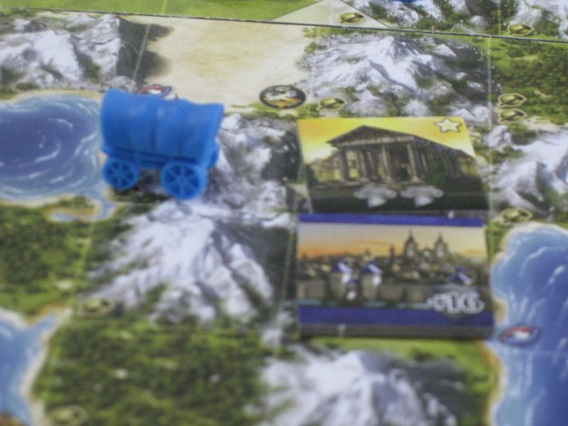 Le marteau permet de construire des bâtiments, les deux flèches rouges et bleues les points de commerce, la colonne des points de culture. On trouve aussi parfois des généraux qui améliorent l'armée ou quelques pièces qui vont nous emmener vers le troisième type de victoire : la victoire économique.