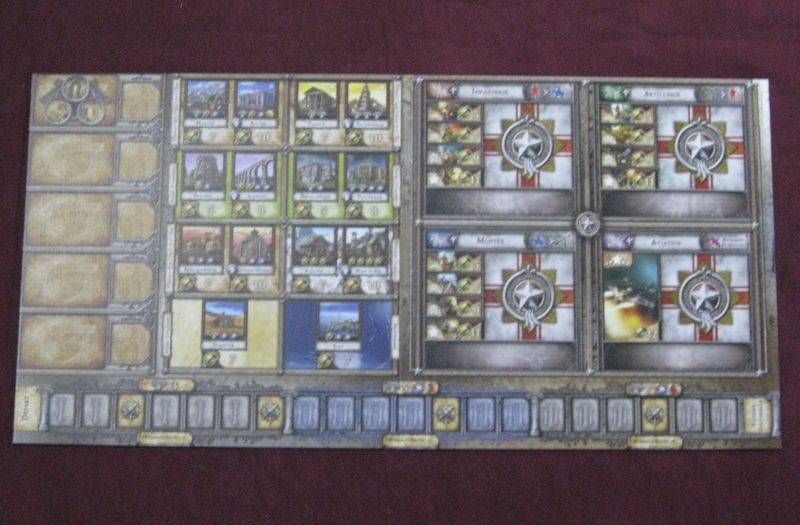 On trouve aussi un autre plateau, cette fois-ci en un seul morceau. On y dispose les éléments de jeu comme les bâtiments ou les merveilles qu'on verra plus tard.